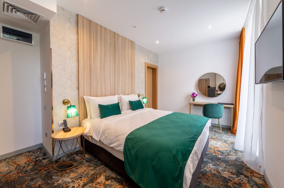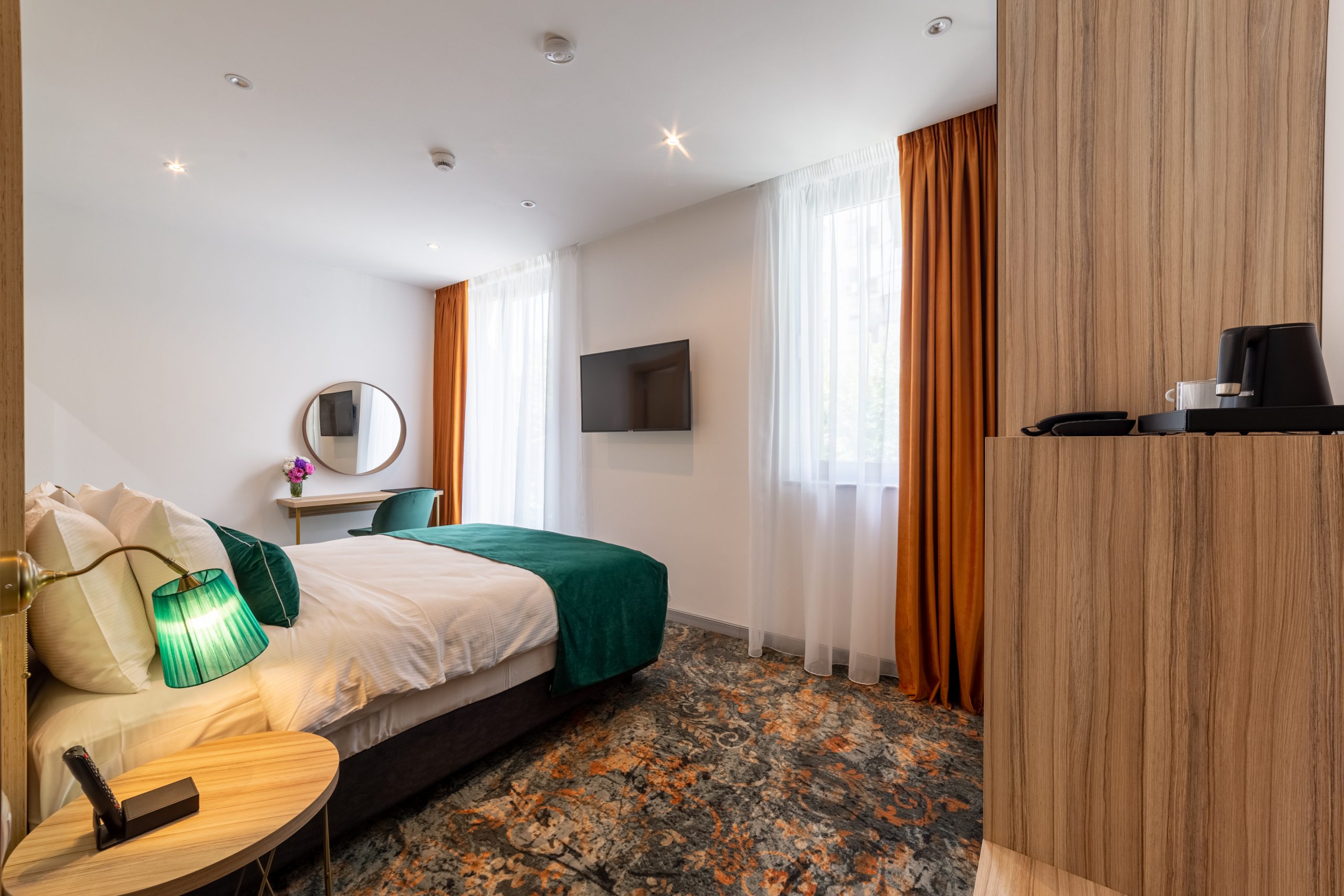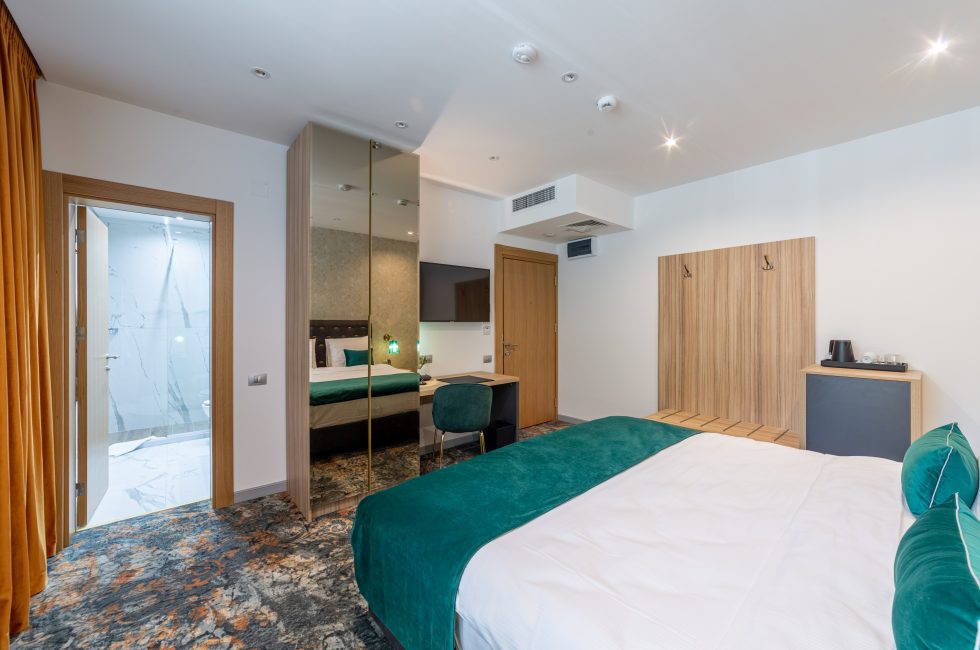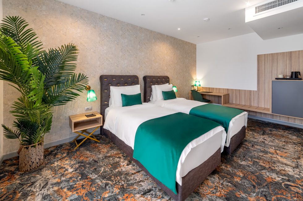 The modern rooms with smart, bright design and contemporary furniture are perfect for business trips. Upon request, the double bed configuration can be specified ( ) . Rooms on the upper floors have high floor-to-ceiling windows.