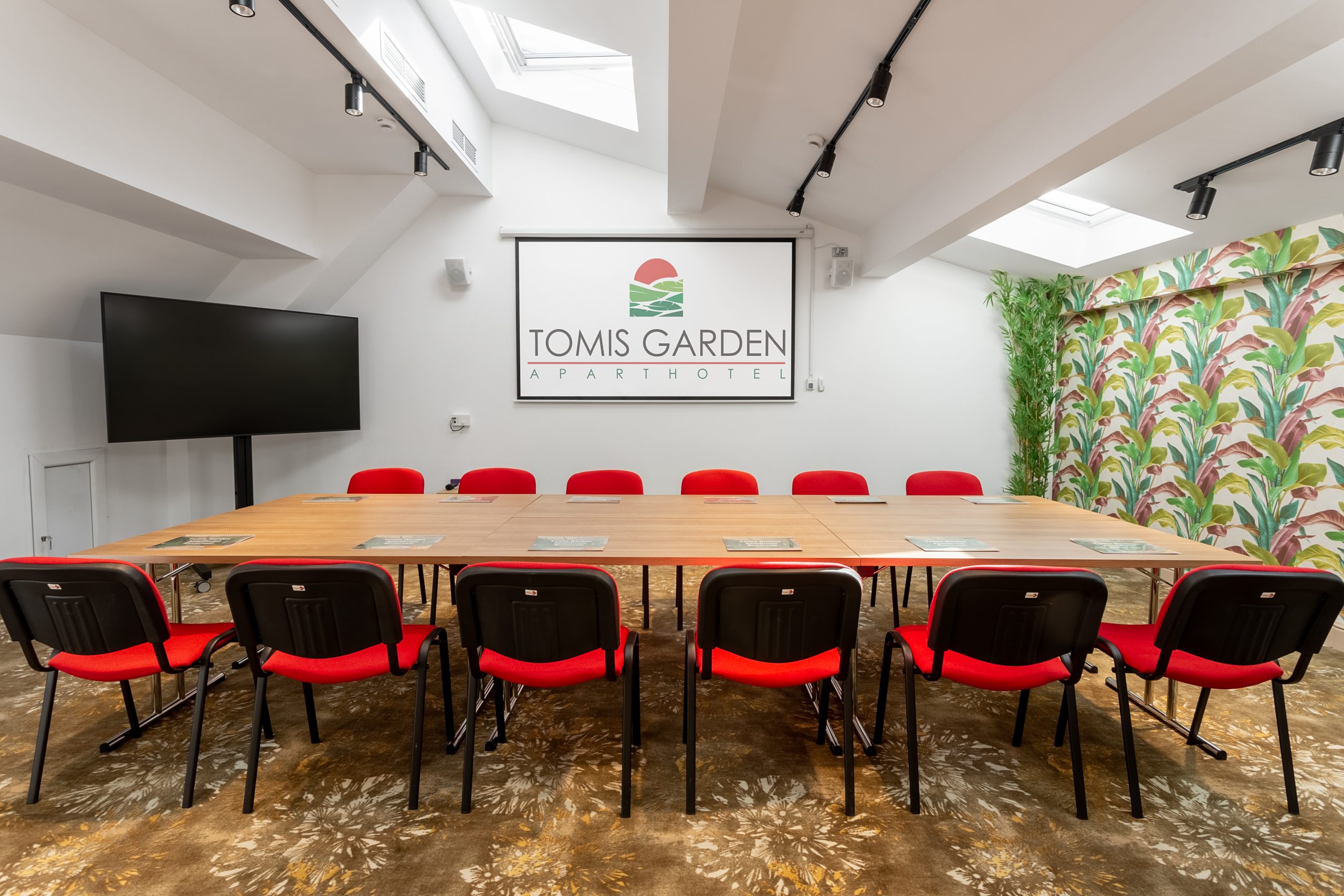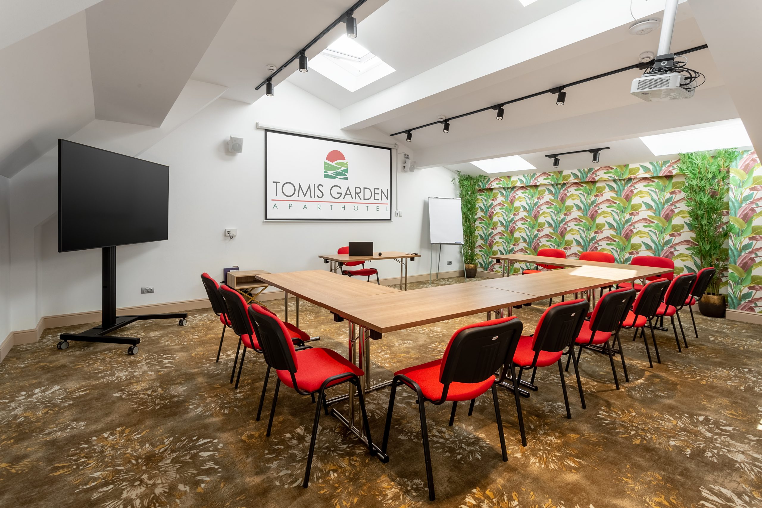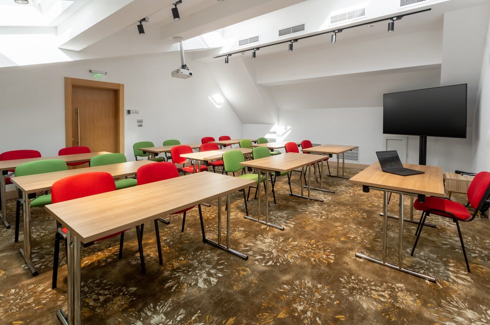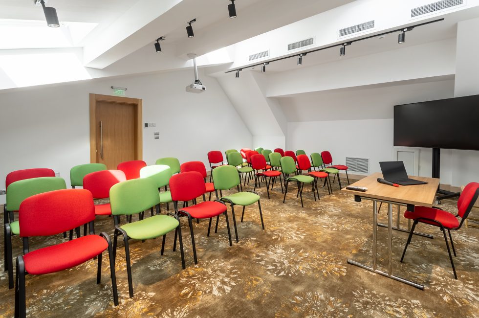 The conference rooms have standard equipment included: video projector, projection screen, sound system, 75″ LCD TV, Wi-Fi internet, wireless microphone, flipchart and consumables.